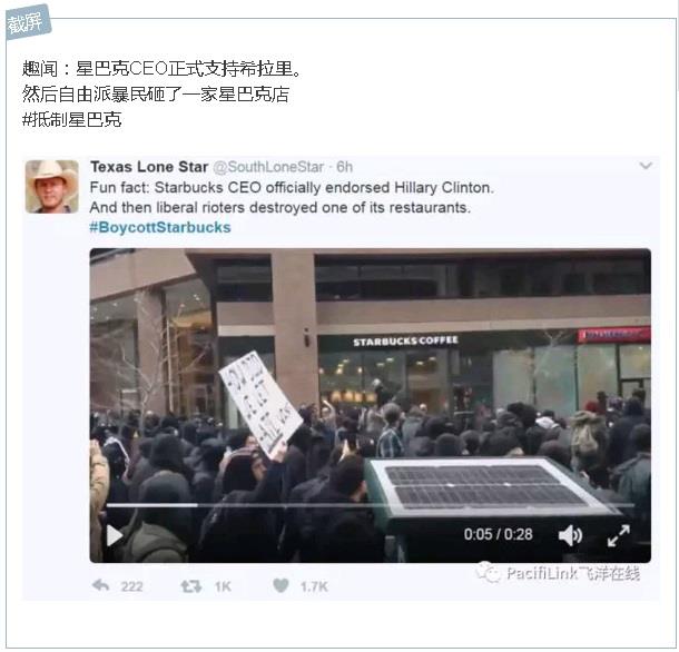 大选期间星巴克CEO公开支持希拉里,并且因为#TrumpCup风波已经和川普支持者打了一仗。 星巴克CEO同时也是坚定的同性婚姻支持者。2013年Schultz在回答问题时说,那些支持传统婚姻(一男一女)的投资人如果觉得别的公司回报率更高,那就卖了我们的股票好了。网传的一段话更是让保守派人士怒从中来:如果你支持一男一女的传统婚姻,我们(星巴克)不需要你的消费。但是这段话未经证实。 以下是几个推特发帖: