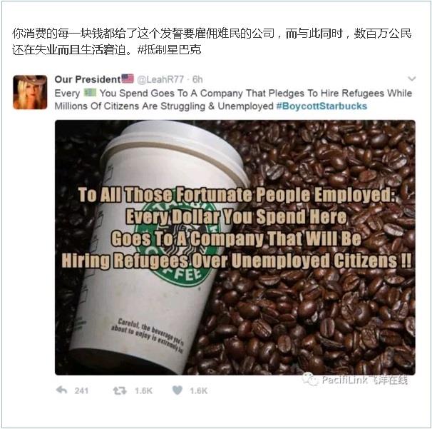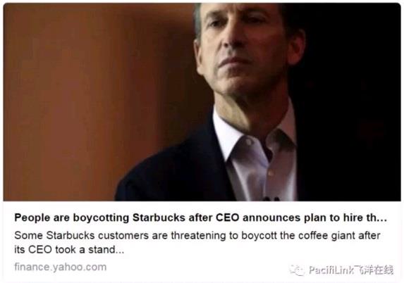 咖啡店星巴克(Starbucks)不负众望,第N次把自己拉进政治漩涡,并且毫无悬念地成为又一次抵制风潮的对象。 即将卸任的CEO Howard Schultz周日发表声明,许诺星巴克将雇佣10,000名难民,用以回应川普暂停难民入境的行政令。 周一早晨"抵制星巴克"成为推特上的头号话题,并且持续了整整一天。右派(保守)人士发誓不再进星巴克,因为很多美国人尚且找不到工作,特别是年轻人,为何要优先照顾本来就不受欢迎的中东难民。左翼(自由派)人士则欢呼雀跃,因为照顾难民才凸显大爱,何况还能与川普针锋相对。