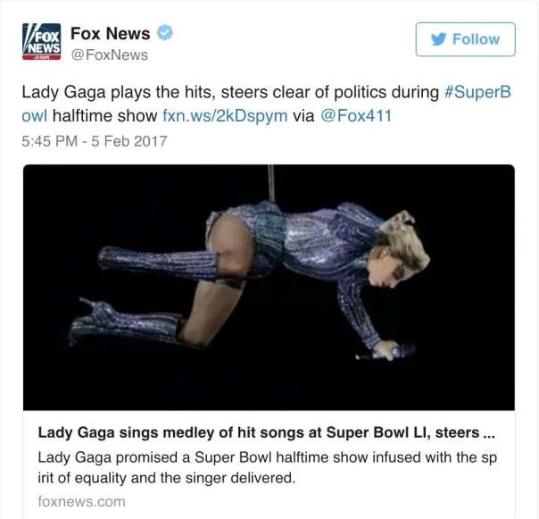 当然这个表演也有没看懂的——比如保守派媒体Fox就发了一张Lady Gaga照得不好看的角度,说“Lady Gaga唱了名曲,没有把政治带进娱乐”。