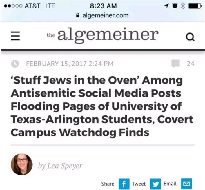 经过几十年的发展,目前MSA组织的成员基本上都是穆斯林移民在美加生长的2-3代穆斯林,从小在美加接受的西方民主教育,大家一定纳闷这些小穆斯林从哪里得到的对犹太人的仇恨。 看看德州大学 Univ of Texas Arlington 2017年2月15日的一个报道:【8】