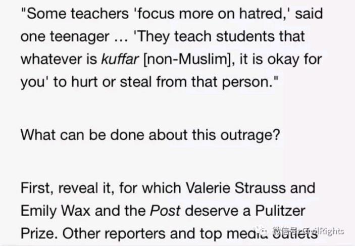 4. 小穆斯林的仇恨从何而来 看看2002年fox news 的报道【10】,Washington Post 记者采访了美国的不同的穆斯林学校,包括幼儿园、小学、中学、高中,所看到的是教科书的“穆斯林,主的仆人,这是躲藏在我后面的犹太人,你们过来,杀了他”,不同年龄、年级的穆斯林孩子表示“在穆斯林学校受到的教育是不要喜欢基督徒、犹太人,以及什叶派穆斯林”,“对kuffar (卡非尔,穆斯林对非穆斯林人士的蔑称),你们可以伤害他及偷拿他的物品”。