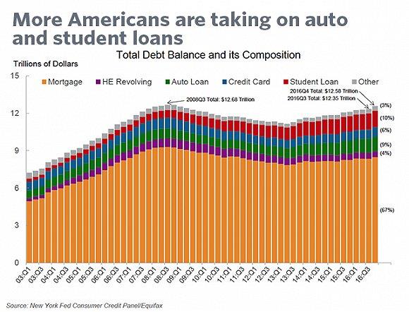 纽约联储周三发布的一份新报告显示,2017年3月,美国的家庭债务总额达12.73万亿美元,超过了2008年最高的12.68万亿美元。 虽然债务水平和2008年相似,但随着近年来家庭收入的增加,股价和房价的攀升,不同债务的占比出现了变化。 相比2008年,拥有住房相关贷款的人数有所下降,其中包括按揭贷款和房屋净值贷款。而拥有汽车贷款和学生贷款人更多了。这也支持了此前的研究:学生贷款使年轻消费者更难买房。 纽约联储的报告还显示出,除了学生贷款以外,2008年以来债务违约90天或更长的情况大大改善。 相比2008年时的最高点,2017年的住房相关贷款减少了近1万亿美元,汽车贷款总额上升了3670亿美元,学生贷款总额更是增加了6710亿美元。