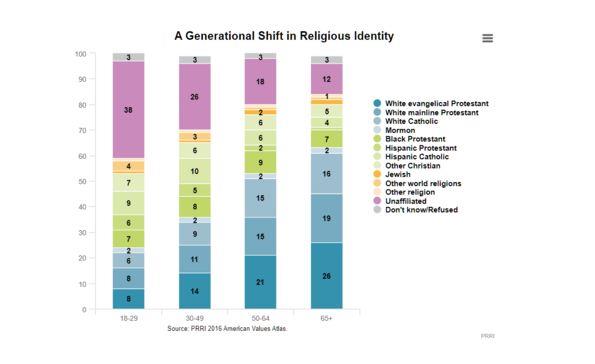 白人基督徒在美国人口比例如今不足50%,与之对应的则是无宗教归属者的崛起。 美国研究机构PRRI周三发布的调查结果显示,当前只有43%的美国人是白人基督(天主教&新教)徒,白人新教徒在美国人口比例中占三成。 而追溯到1976年,白人基督徒的比例高达81%,白人新教徒的比例也达到55%。 非基督教宗教团体出现增长,但犹太教人口仅占2%,穆斯林、佛教徒和印度教人口占比不过1%。 与此同时,美国非宗教人口比例出现上升。无宗教归属者占总人口比例从1991年的6%跃升至24%,并已“占领”二十个州。下图为美国宗教团体人口所占比例示意图。 (图片来自PRRI) 值得注意的是,无神论者和不可知论者并非“无宗教归属者”的主力军,其占无宗教归属者的比例仅为27%。相反,“世俗人士”则占了无宗教归属者较大比例,约为58%。 哪种宗教团体最富裕? 该研究从50个州中抽取超过10.1万人进行调查。调查称,从家庭收入角度来看,在宗教团体中,收入水平最低的是少数族裔基督徒团体,43%的黑人新教徒及45%西班牙裔新教徒等群体家庭年收入不足3万美元。 在宗教团体中,收入水平最高的是白人基督徒团体,只有不超过1/3的白人福音派新教徒等家庭年收入不足3万美元。 在非基督教团体中,约有38%的穆斯林教徒、31%佛教徒、20%印度教徒以及16%犹太教徒家庭年收入不足3万美元。 总体而言,美国人家庭收入的平均水平超过10万美元,仅有18%的家庭年收入不足3万美元。 无宗教归属者年轻化 按年龄划分,年轻一代(年龄在18-30岁)美国人中,有38%声称自己是无宗教归属者。 穆斯林、印度教和佛教团体所处主要年龄段远远低于基督徒团体,42%的穆斯林、36%的印度教徒以及35%的佛教徒年龄都在30岁以下,而62%的新教徒、62%的天主教徒年龄都在50岁以上。 下图为各宗教团体在各年龄段美国人所占比例。随着年龄的增加,无宗教归属者比例持续下降,白人基督徒团体比例则逐渐上升。 (图片来自PRRI) 此外,民主党中白人基督徒比例已经从十年前的50%缩水至如今的29%,18-29岁的民主党人中仅有14%为白人基督徒。而在共和党人中,约有73%属于白人基督徒宗教团体。 尽管白人基督徒的比例跌破50%,但在《华盛顿邮报》看来,未来美国的基督徒人口比例仍然在一半以上。 《华盛顿邮报》预计,到2050年,即便白人基督徒比例不足50%,仍会有一半以上的美国人是基督徒。如果要思考这在政治方面的意义,当人们提起“白人基督徒”这个词时,到底是“基督徒”还是“白人”能够引发共鸣呢? 本文来自华尔街见闻(微信ID:wallstreetcn),作者刘怡心。