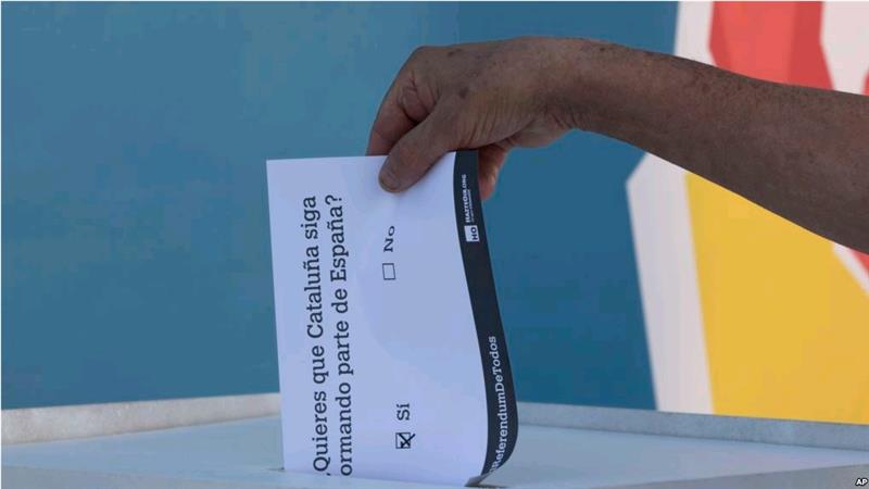 西班牙首都马德里民众抗议加泰罗尼亚计划举行的独立公投,象征性地投下反对票 (2017年9月29日) 华盛顿 — 尽管加泰罗尼亚自治区政府紧锣密鼓地为星期天的独立公投做准备,但是西班牙政府表示,星期天的独立公投不会如期举行。 西班牙文化大臣迪维哥星期五说,独立公投违反了西班牙法律,政府不承认公投结果。 他说:“我们愿意在法律框架下展开对话。大家一定会理解,没有人能够要求我们在法律框架外进行对话。这是不可能的。” 加泰罗尼亚有关当局说,如果民众通过公投选择离开西班牙的话,他们将在公投结果揭晓48小时内宣布独立。西班牙政府一直试图阻止公投的举行,并下令警方没收跟公投有关的一切材料,并禁止公共设施被用做投票站。 加泰罗尼亚的农民星期五开着拖拉机缓慢地穿过巴塞罗那街道,挥舞着支持独立的旗帜和标语。这些拖拉机最终在自治区政府大楼前会合。 与此同时,欧盟官员说,这是西班牙的法律问题,因此不会出面调解。 欧洲议会主席塔亚尼说:“这是西班牙自己的问题,我们没什么可以做的。这事关对西班牙法律的尊重,西班牙人要自己解决。” 欧洲委员会副主席蒂默斯曼呼吁欧洲人尊重本国的宪法和法治。他说:“法治就是要遵守法律和宪法,不管你喜欢不喜欢。” 加泰罗尼亚有关当局曾要求欧盟帮助,称西班牙政府虚弱了他们的民主价值观。