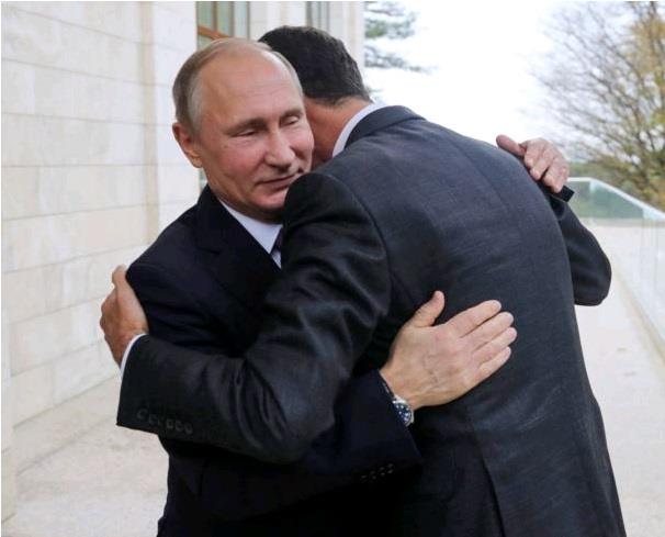 Russian President Vladimir Putin, left, embraces Syrian President Bashar al-Assad in the Bocharov Ruchei residence in the Black Sea resort of Sochi, Russia, Nov. 20, 2017. His power ensured, Asssad said he expressed his gratitude to Putin "for all of the efforts that Russia made to save our country." Putin, according to the Kremlin, told Assad that Russia's "military operation is coming to an end. Thanks to the Russian army, Syria has been saved as a state. Much has been done to stabilize the situation in Syria." He praised Assad, predicting terrorism would suffer an "inevitable" defeat in Syria. The Kremlin quoted Assad as saying, "It is in our interest to advance the political process. ... We don't want to look back. And we are ready for dialogue with all those who want to come up with a political settlement." U.N.-led peace talks about Syria are scheduled for November 28 in Geneva.