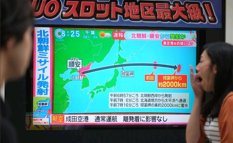 Pedestrians look at a television screen broadcasting a news report in Tokyo, following a North Korean missile test that passed over Japan, Sept. 15, 2017.