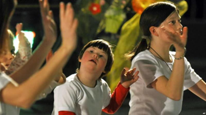 一个患有唐氏综合症的孩子(中)在一个为有残疾的孩子举办的音乐会上参加演出(资料图片)