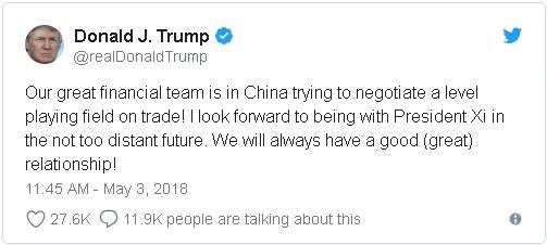 大约在同一时刻,川普总统发出推文说:“我们很棒的金融团队正在中国为争取公平贸易竞争而谈判。我期待在不远的将来跟习主席会面。我们总会有一个良好(很棒)的关系。”