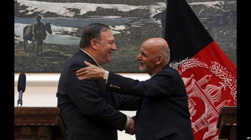 美国国务卿蓬佩奥(左)2018年7月初在阿富汗进行事先未宣布的访问期间与阿富汗总统加尼会见