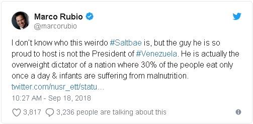 虽然有关视频已于星期二从Instagram上删除,但是星期三仍有几十名委内瑞拉人在名厨努斯雷特·戈克切(Nusret Gokce)的迈阿密餐厅外抗议。抗议者身披委内瑞拉国旗,高唱委内瑞拉国歌。他们试图阻止顾客进入这家位于迈阿密布里克尔金融区的高档牛排馆用餐。 其他人纷纷在Yelp网站给这家餐厅差评,迫使其评论区无限期下线。 在其中一段视频中,有“撒盐哥”( Salt Bae)之称的戈克切在伊斯坦布尔的努斯尔餐厅为马杜罗总统和夫人西莉亚·弗洛雷斯切牛肉。每块肉的价钱可能都有几百美元。 另一段视频显示,马杜罗吞云吐雾地抽着雪茄,雪茄盒上印着他的名字。 来自佛罗里达州的马可·鲁比奥参议员抨击了这位厨师。