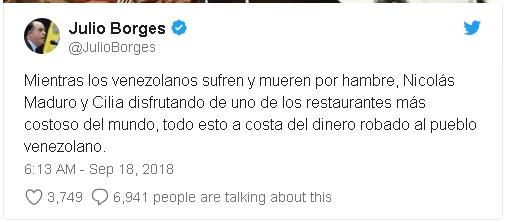 流亡在哥伦比亚的反对派领袖胡里奥·博尔赫斯发推说:“在委内瑞拉人受苦和饿死之际,尼古拉斯·马杜拉和西莉亚·弗洛雷斯却在全世界最贵的餐厅之一大快朵颐,用的全是盗窃委内瑞拉人民的钱。” 然而,出国享受了这次豪华盛宴的马杜罗无悔无恨。他在返回加拉加斯后说:“我在这里向我们的朋友努斯雷特致意。同志,我很快就会回到伊斯坦布尔再度相会。感谢馈赠。” 盛产石油的委内瑞拉一度颇为富裕,但是过去五年来一直处在经济危机之中。动荡使很多委内瑞拉人缺食少药,大批人被迫逃亡其它南美国家。 据联合国说,自从2014年以来,有两百多万委内瑞拉人逃离出国。 《迈阿密先驱报》上个月发表的Meganalisis民调显示,超过30%的委内瑞拉人说,他们一天只吃一餐。将近同样数目的人报告说,他们每星期至少一天“没有或几乎没有”吃东西。多达78%的人说,他们难以找到足够的食物。