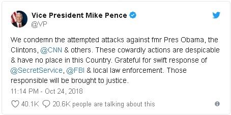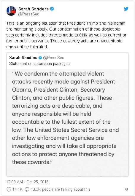 装有炸弹的包裹邮寄给了一些公众人物,包括前总统奥巴马和特朗普在2016年总统大选时的民主党对手希拉里·克林顿。特朗普在白宫说,他得知这一情况后,“极其愤怒和不满”。 类似的包裹还寄给了一位前司法部长、一名民主党众议员和一位前中情局局长。他们都以批评特朗普总统而出名。 特朗普总统说,联邦当局正在大力调查,以确定是谁寄的包裹。 特朗普说:“美国人民的安全是我最关心的。”