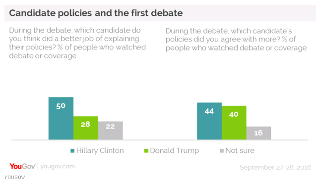 A majority, 56 percent, said that Clinton displayed a presidential temperament during the debate. Just 34 percent said the same of Trump, who claimed during the debate that his temperament was his “strongest asset.” Clinton led on laying out her positions, with half of those polled saying she did a better job of explaining her policies, 28 percent naming Trump, and 22 percent unsure. But asked which candidate’s policies they most agreed with, respondents sided with her by a far narrower margin, giving her 44 percent to Trump’s 40 percent.