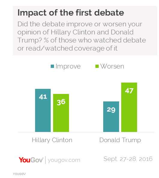 Hillary Clinton scored a decisive debate victory over Donald Trump, coming off as more presidential and better prepared, according to a new HuffPost/YouGov poll. By a 27-point margin, 49 percent to 22 percent, Americans who had heard at least something about Monday’s presidential debate said that Clinton did a better job than Trump. Twenty-two percent said neither had done a better job, while 8 percent were unsure. Those results are broadly in line with other scientific post-debate polls, which also found a sizable advantage for Clinton. (A spate of online reader “polls,” which Trump has touted as showing him ahead, have no scientific grounding whatsoever.) Seventy-seven percent of those polled, including a majority in both parties, said that Clinton prepared well enough for the debate, compared to just 27 percent who said the same for Trump. Even 43 percent of Republicans said that Trump should have done more preparation.